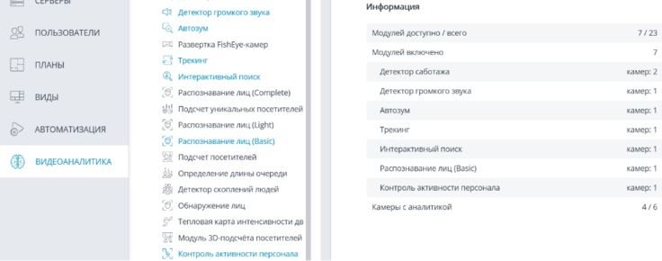 - Информация со сводной таблицей, в которой содержатся сведения о модулях и камерах с аналитикой;