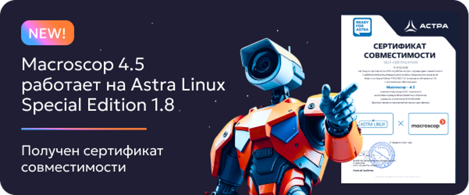 Macroscop 4.5 поддерживает работу Astra Linux SE (1.7, 1.8) в режимах защиты «Орёл», «Воронеж» и «Смоленск» без динамического контроля целостности (ЗПС), МКЦ (Мандатный контроль целостности) и МРД (Мандатное управление доступом).